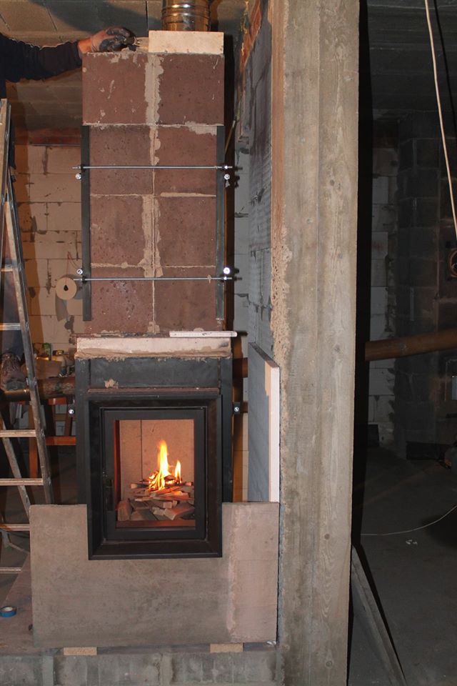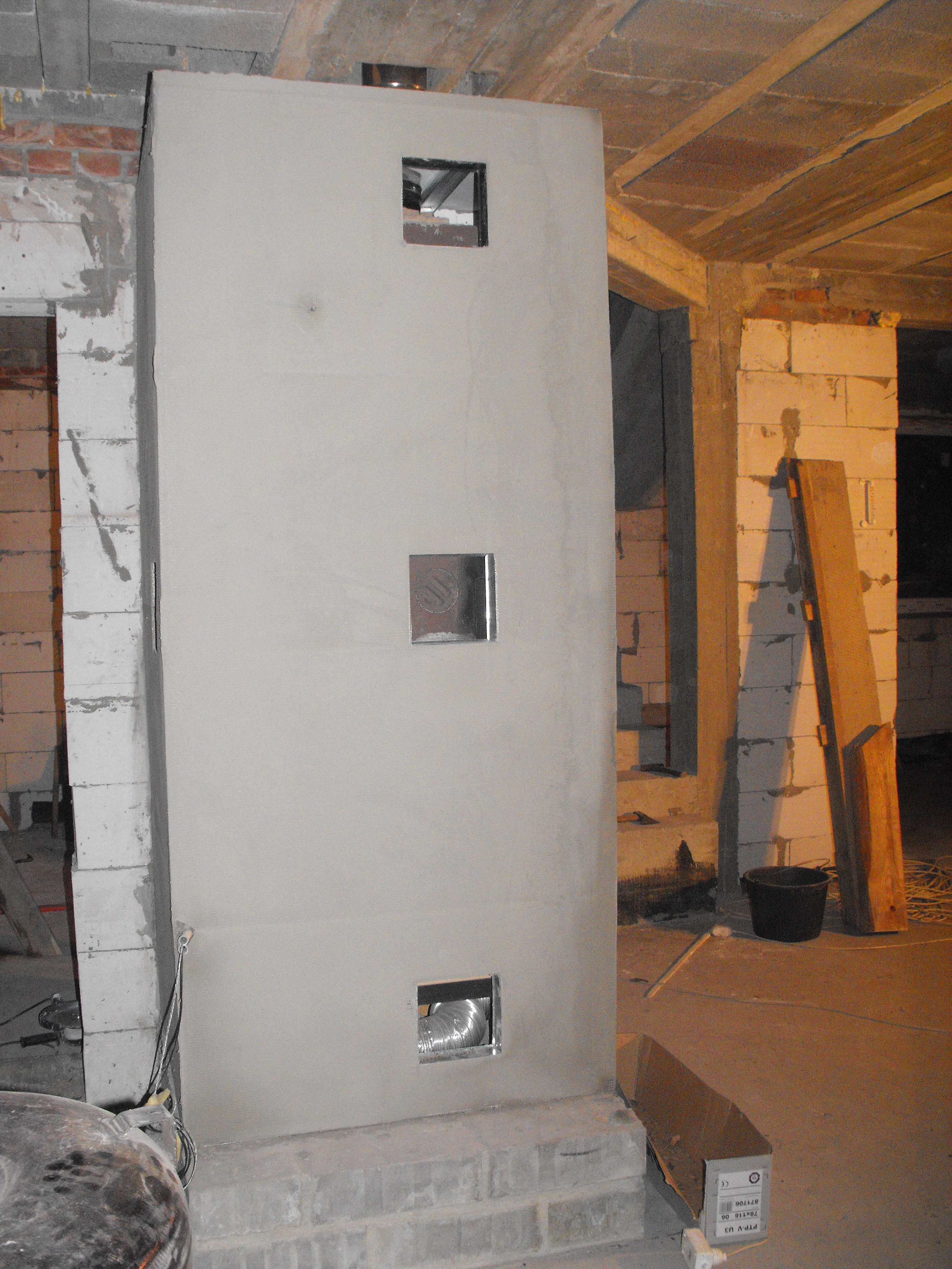 Tylna ściana pieca będzie ścianą w pokoju na dole, ściana działowa będzie dostawiona do boku pieca aby piec wystawał do pokoju.