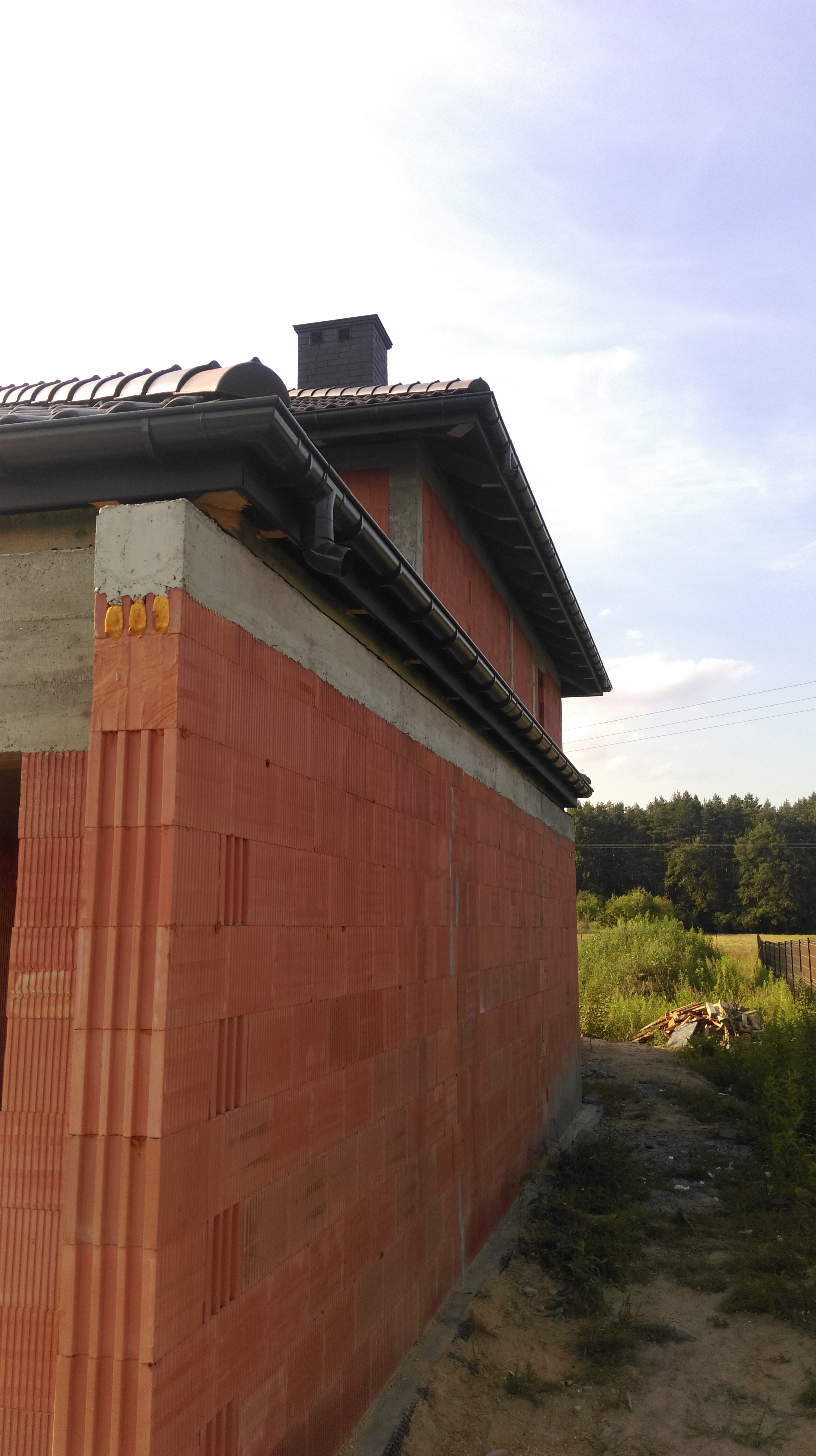 Chodziło o kwestie okapu i wentylacji kuchni - zgodnie z przepisami musi iść albo po ścianie albo przez dach z kominkiem 30cm nad połacią dachu. Jak zauważysz mamy takie dwa grzybki tam i do jednego będzie podpięty okap a do drugiego wentylacja. Takie rozwiązanie jest również w projekcie. My to zrobiliśmy, żeby nam kominiarz nie kazał przy odbiorze wyprowadzać wentylacji ścianą nad dach bo to byłaby porażka. Budowlańce też się zastanawiali co to jest ale kominiarz przyznał, że w przypadku kuchni z palnikami gazowymi bez takiego wyprowadzenia byłby kłopot. My zrezygnowaliśmy z wentylacji mechanicznej więc coś musieliśmy wymyślić, ale sam daszek jak pisałem jest przewidziany w projekcie.