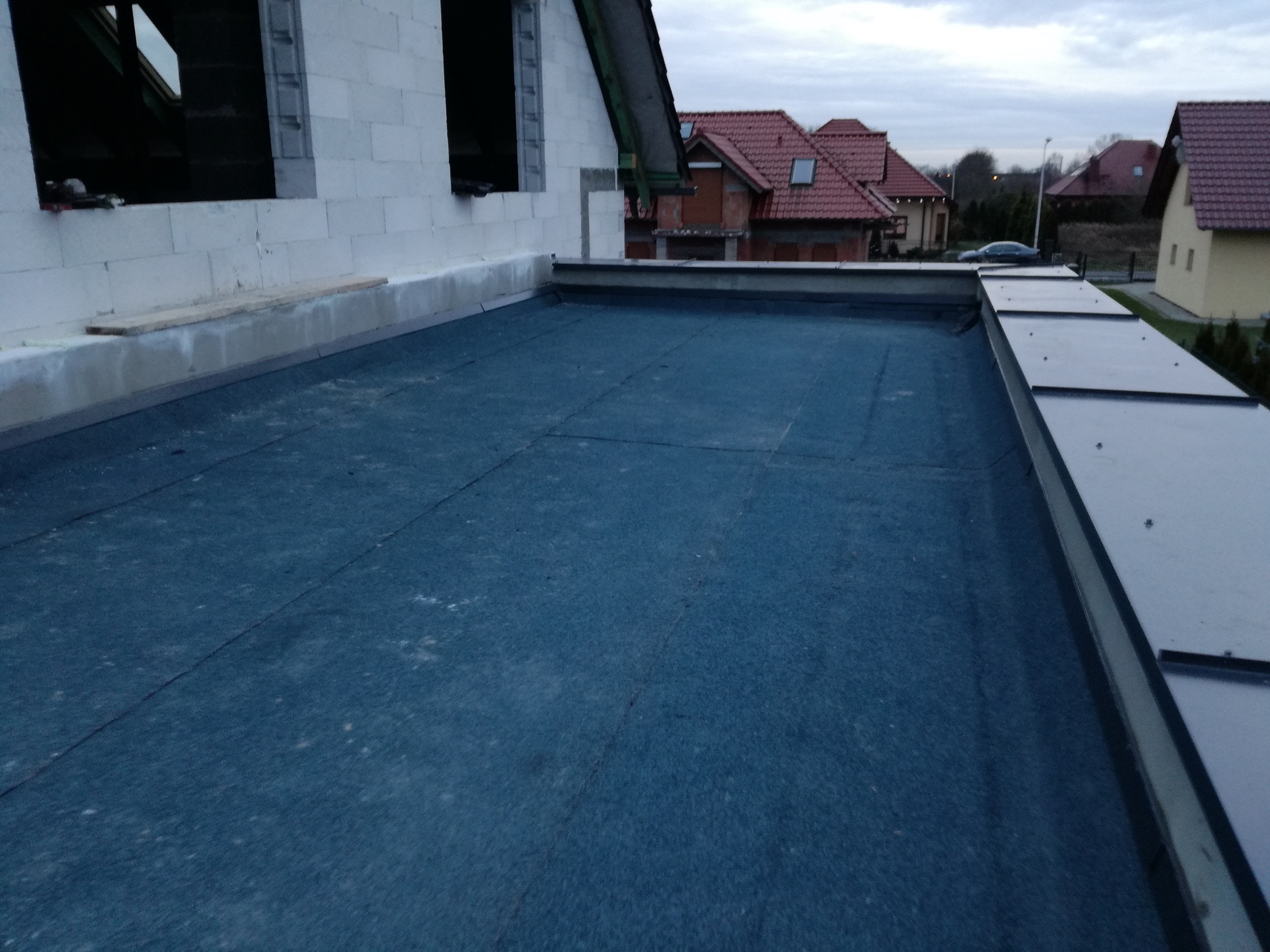 Oh to była męka. Wiem, ze ci przede mną wylewali masę bodajże zywiczna. My założyliśmy rynnę przy murku i papę. Pamiętajcie o odpowiednim kierunku spadku tarasu na zewnątrz. Nasza ekipa tu popełniła błąd dlatego musieliśmy go sztucznie zmienić poprzez warstwy papy