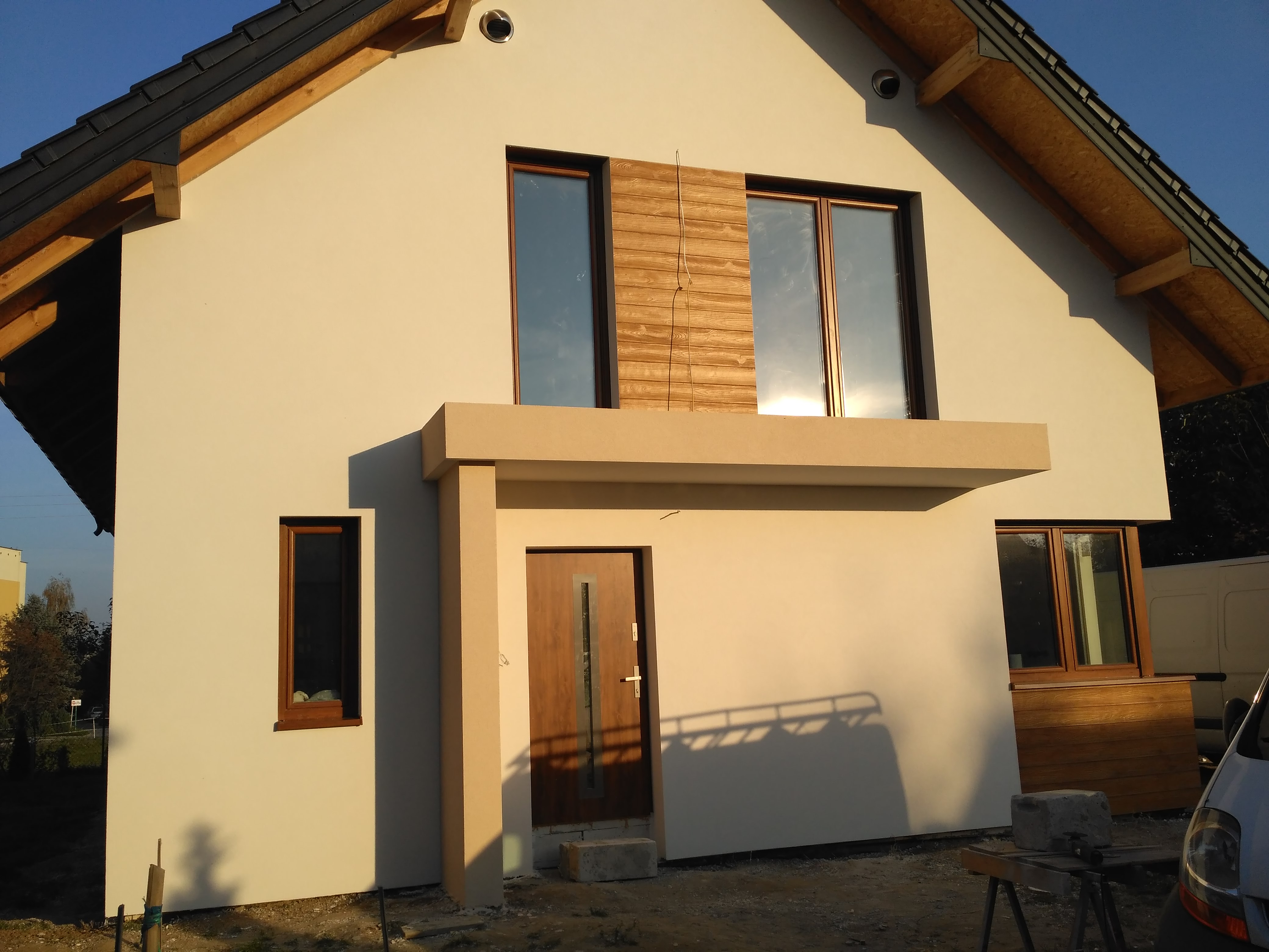 Przed nami montaż kominka, pieca na pellet, wkopywanie szamba, bednarka. Wszystko na dniach... Balkon jest w trakcie "tworzenia". Jak będzie piec, zaczynamy działanie w środku typu kafle w łazience itp.