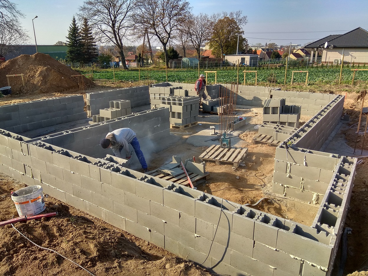 Prace postępują. Fundamenty robimy systemowo, w środek pustaków zostanie zalany beton.