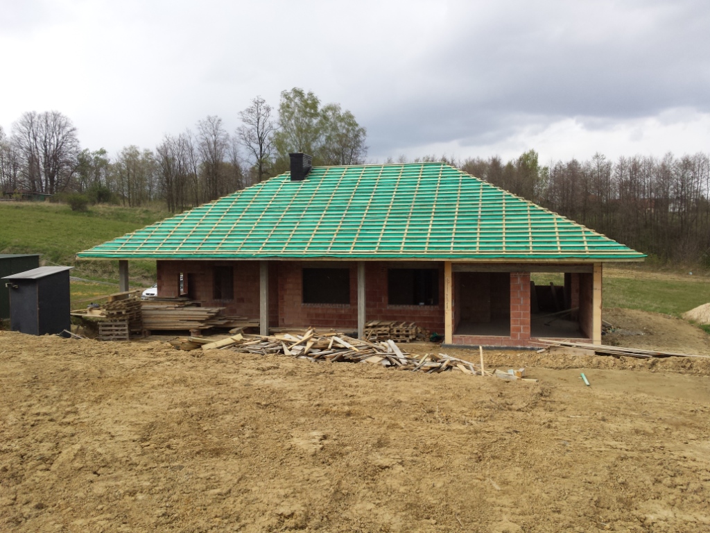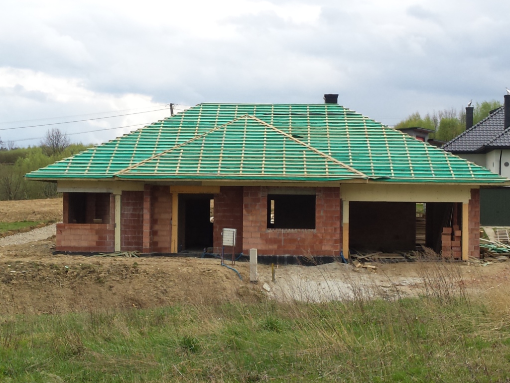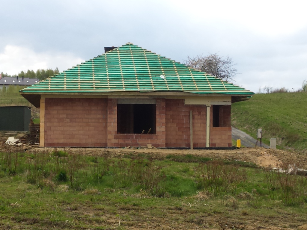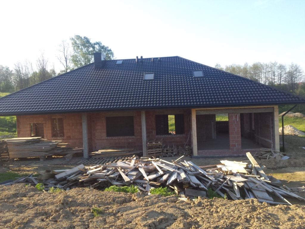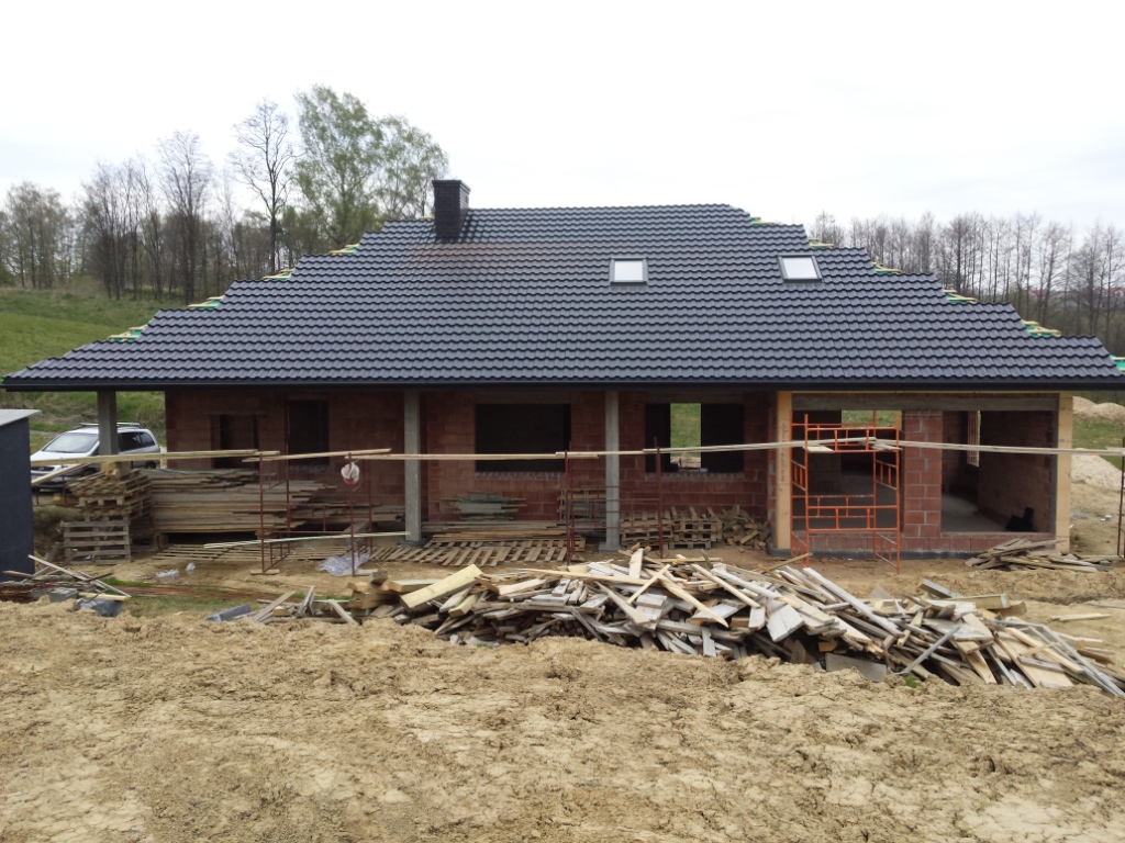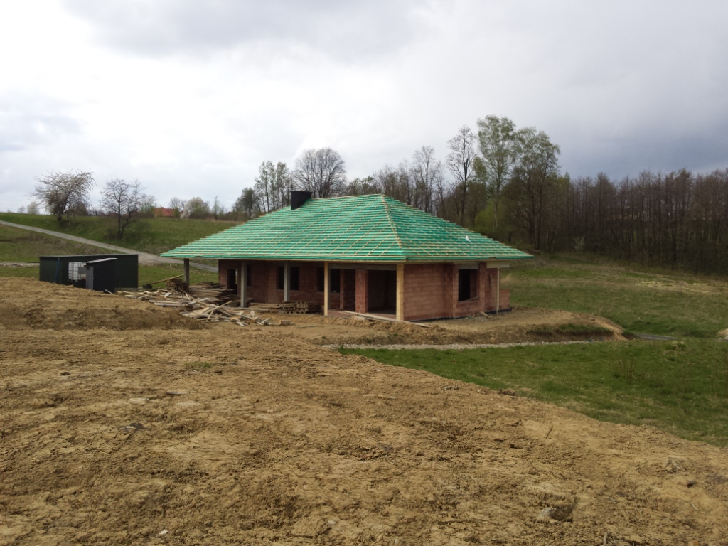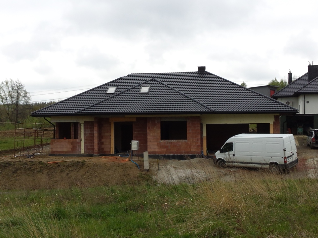 Zdecydowalismy sie na budowe domu Wiesiołek II G2 NF 40 . Klasyczna parterówak , nowoczesny wyglad , przestronne wnętrz. Atutem jest duza kotłownia z osobnym wejsciem z zewnątrz, Obszerne wnętrze pozwoli wybrać rodzaj paliwa jakim bedzie ogrzewany dom. Materiał kontrukcyjny to Leier THERMOPOR® 25 P+W. Strop monolit 18 cm podwojna siatka oczka 14x14 drut fi 12. Zdecydowalismy sie zrobic ścianke kolankowa pustak plus wieniec w sumie 50 cm co przyczyniło sie do podniesienia wysokości uzytkowej na poddaszu do 255cm.Schody betonowe w wiatrołapie to zaleta, ktora oddziela parter od poddasza uzytkowego. W sumie na poddaszu mamy zaplanowane 2 pokoje , łazienke, salon z aneksem. Przestrzeń bedzie wykorzystana w przyszłości. Powierzchnia nad grażemi kotłownia pozostała jako stych. Przeprojektowalismy dach na klasyczna koperte z lukarna . Poszycie dachu to Rukki finnera czarny mat. Zamontowalismy 5 okien dachowych . Jedno oswietla klatke schodawa.
