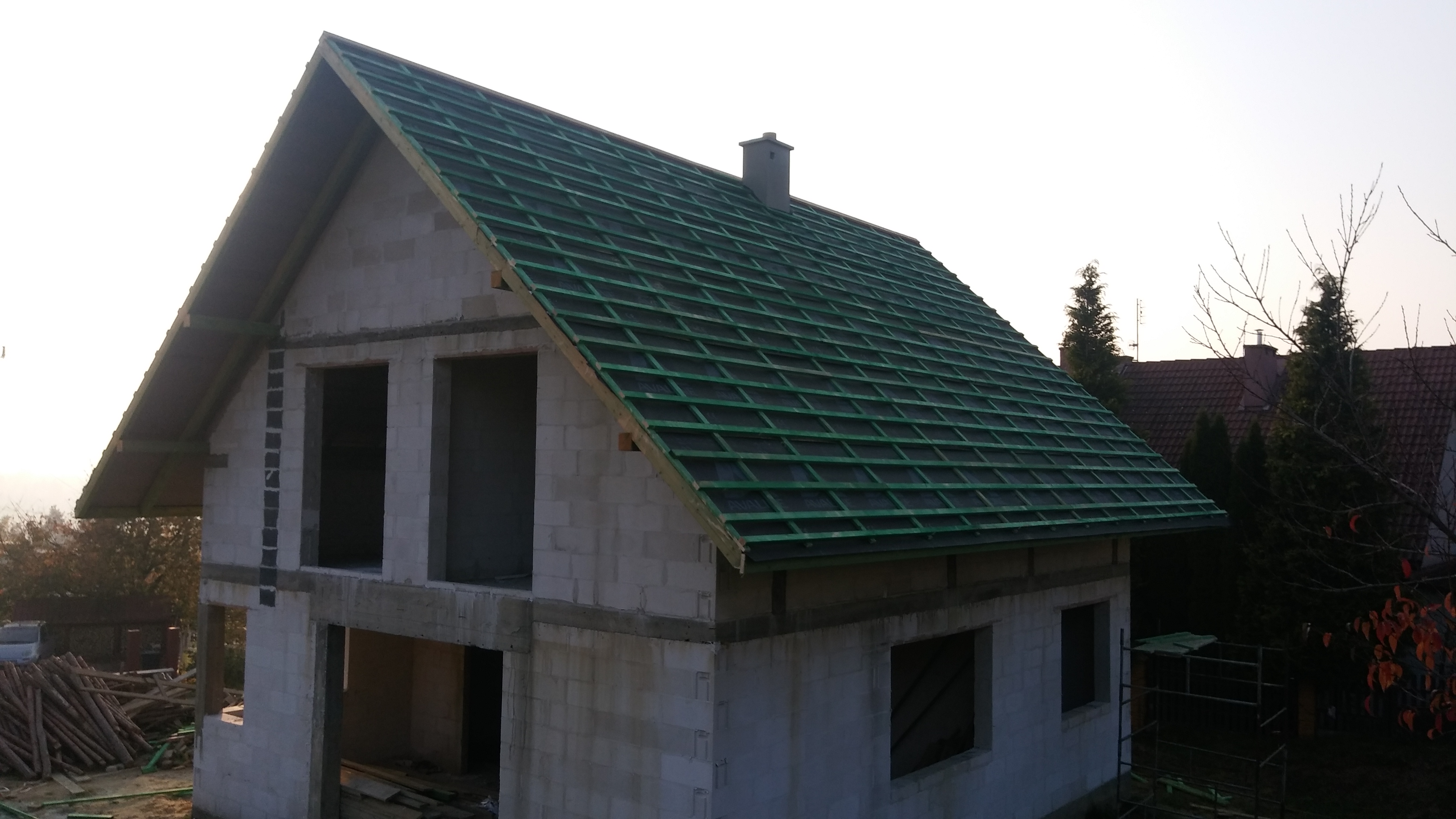 Czekamy na klinkier na kominach i blachę na dach.